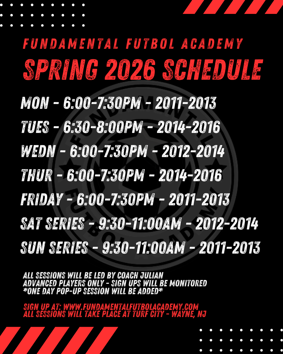 Sessions will cover Technical Work, Ball Mastery, Awareness & IQ Building, Game & Scrimmage Application, & Finishing to Goal! We truly believe in developing our players with a core focus on our philosophy!