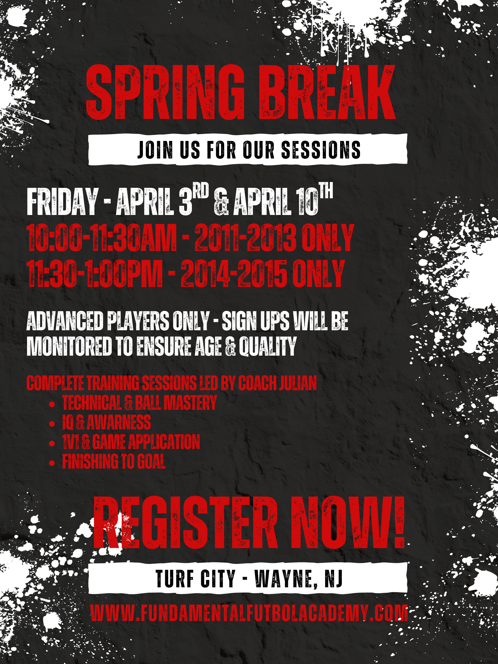Spring Break 2026 Join us for one or both of our Spring Break 2026 Large Group Sessions! Options available for B/G 2011-2015! Join Us for our Spring Break 2026 Sessions on Friday, April 3rd & April 10th at Turf City, Wayne, NJWill be a complete session to cover all aspects of the game, not just TRAINING but COACHING and TEACHING the game!Open to Boys & Girls 2011-2013 and 2014-2015 - Open to Advanced Players Only *Sign-Ups will be monitored, and Spots Are Limited & Subject to Availability* sign up now
